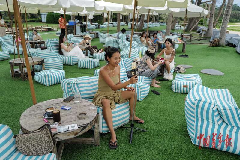 9月24日,海南省万宁市,一位女士在海边直播。据介绍,由于游客不断增多,这片海湾附近的田新村借势发展起民宿、餐饮、俱乐部等配套产业,从传统渔村转型为冲浪爱好者的“后勤基地”,提供住宿、餐饮与培训服务。中青报·中青网记者 赵迪/摄
