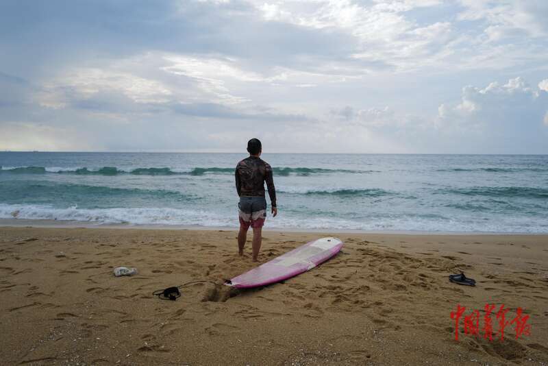 9月25日,海南省万宁市,41岁的杨先生在海边眺望。他说,现在每周都会来这里冲浪四五次。他曾经在北京、深圳等地从事金融类工作,也创过业。十多年前他来到这里,当时这里还是小渔村,只有一家冲浪店。他觉得,在这里找到了和自然的连接。中青报·中青网记者 赵迪/摄