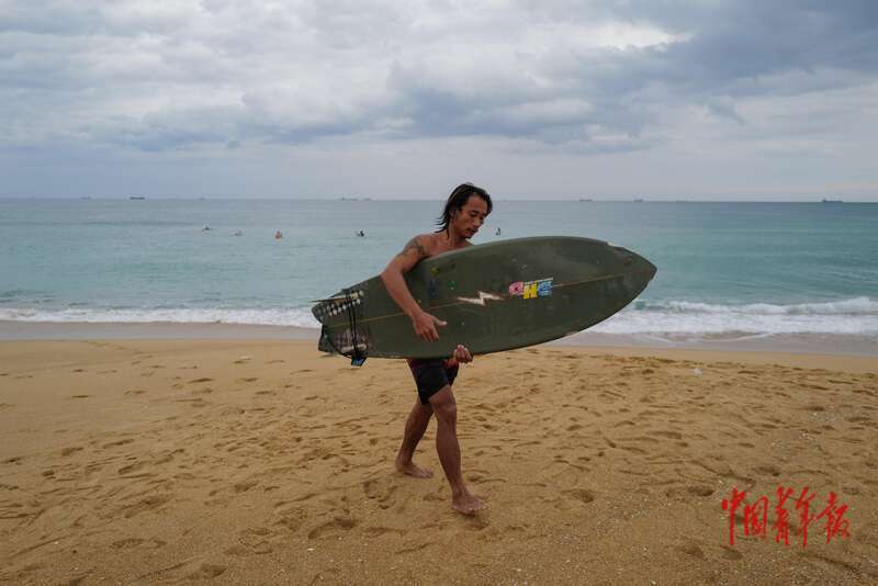 9月24日,海南省万宁市,一位刚刚结束冲浪上岸的男士。近年来,冲浪运动逐渐走入大众视野,海南万宁有优质的冲浪条件,越来越多的全球“浪人”慕名而来,让这里成为远近闻名的“冲浪小镇”。中青报·中青网记者 赵迪/摄